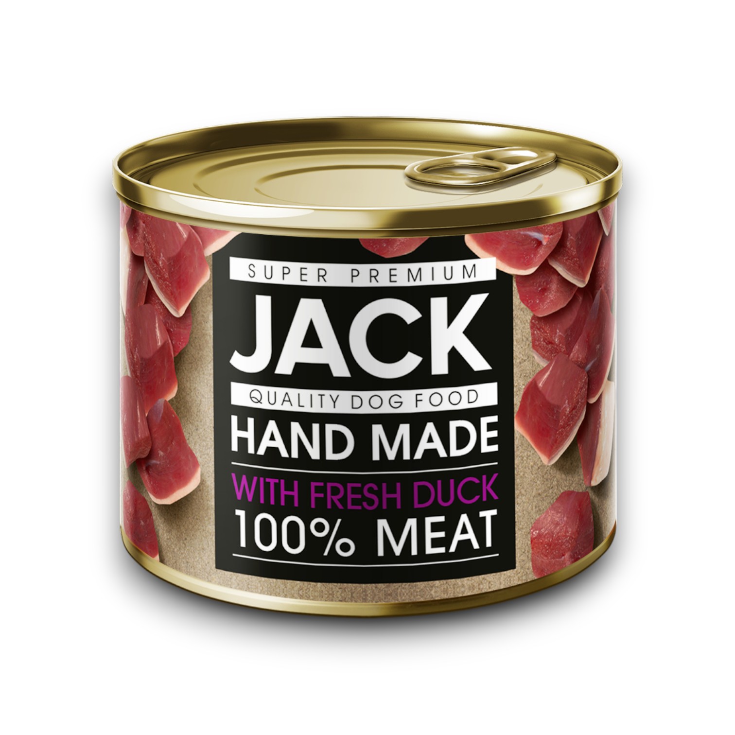 JACK Super Premium complete pet food with duck for dogs contains 100% meat. It contains 50% duck meat, 25% beef and 25% pork. This handmade dog food is cooked in its own juices until the meat is cooked tender and juicy. High-quality, easily digestible canned food for dogs. Thanks to its special production method, it preserves its natural mineral and vitamin content.