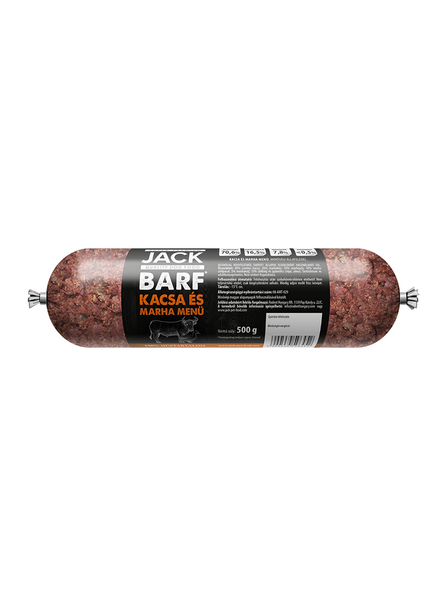 Összetétel: 40% csontos kacsa, 20% marhahús, 10% marhaszív, 10% marha zöldpacal, 5% marhamáj, 15% zöldség és gyümölcs (répa, alma)