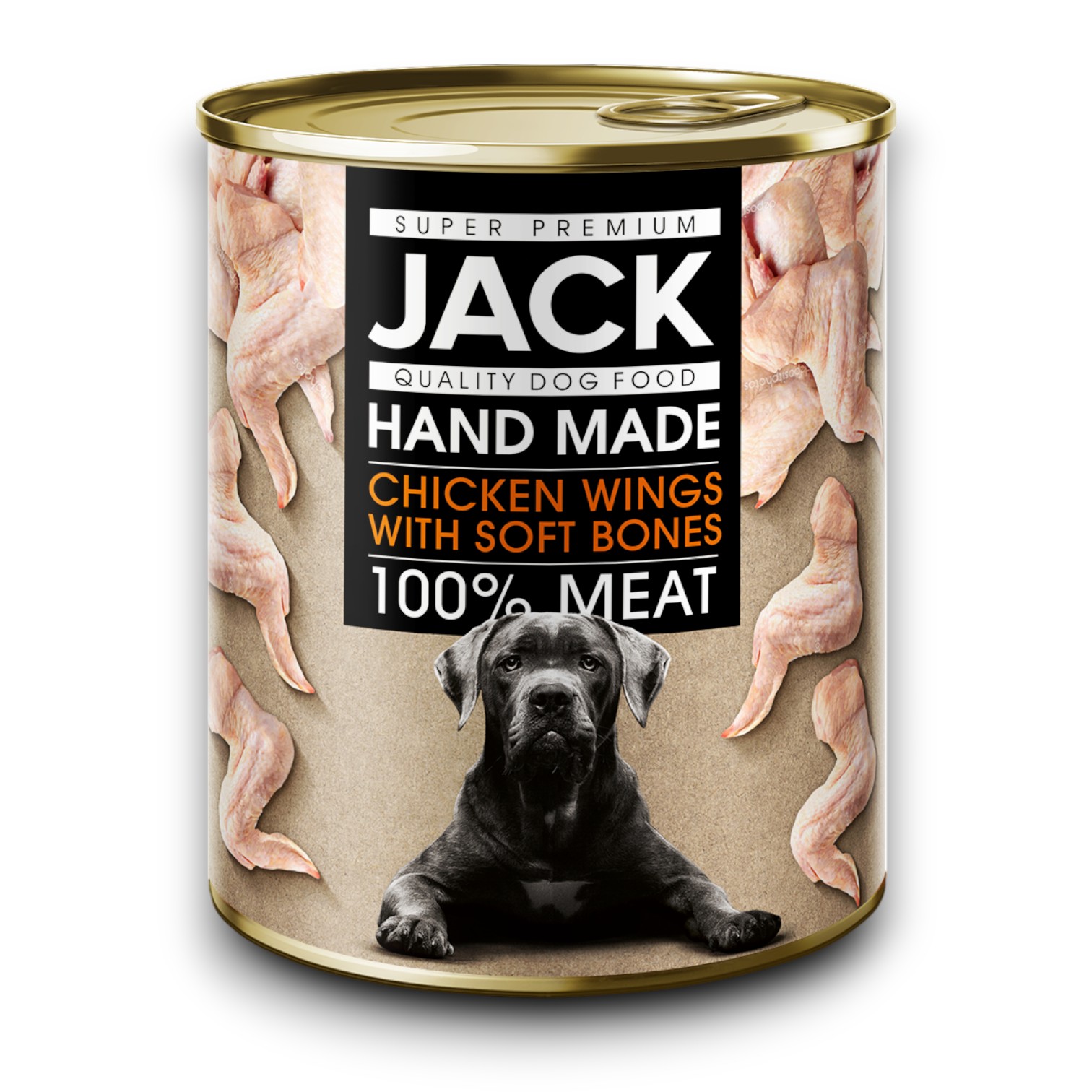 A Jack Super Premium konzerveinkbe kézzel helyezik bele a válogatott egész csirkeszárnyakat. Saját levében addig fő, míg a csont is morzsolhatóvá válik. Ettől lesz a csirkeszárny puha és szaftos. Kézzel készített, teljes értékű, könnyen emészthető, kiváló minőségű kutyaeledel, mely ásványi anyagokban és vitaminokban gazdag!